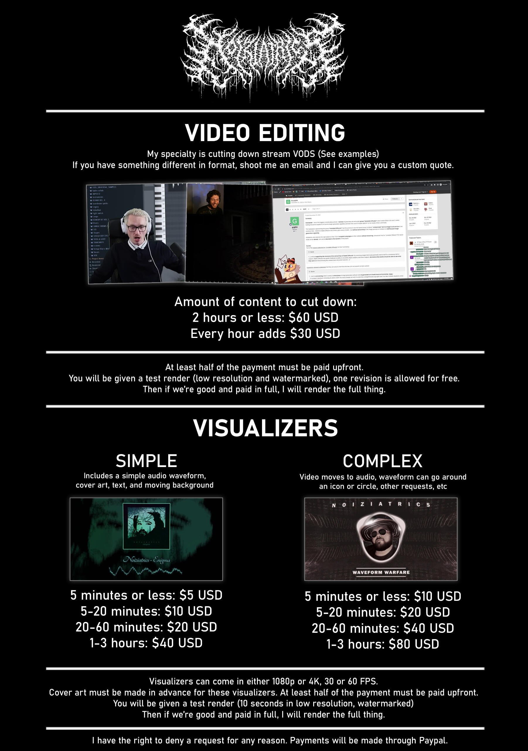 Noiziatrics is a music project from Massachusetts started in 2017. My goofy ahh sound has reached the ears of hundreds in a terrifying manner. My loud hardcore kicks will blow the socks off your neighbors, and their other neighbors too. My genre variety will scare you. Ambient, hardcore, speedcore, noise, techno, experimental, and more. I'm also a visual artist and video editor. Then I'm a physical media nerd who not only collects, but makes CDs homemade.I only have two goals with my art: